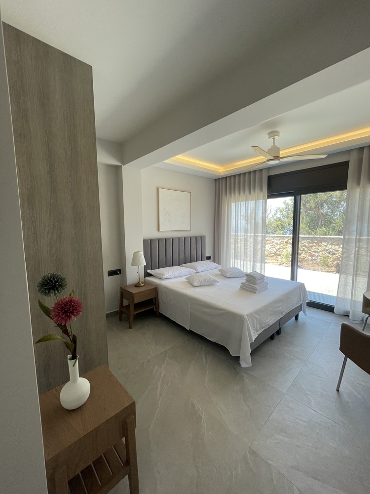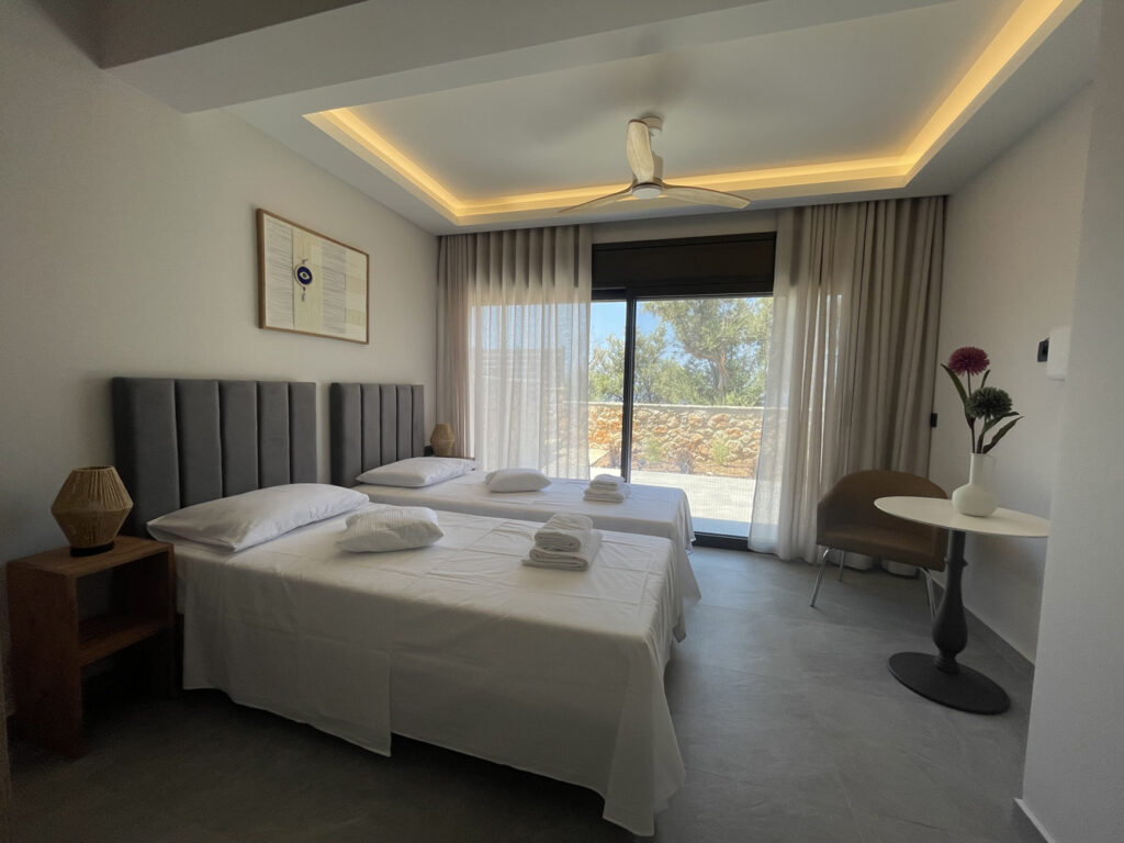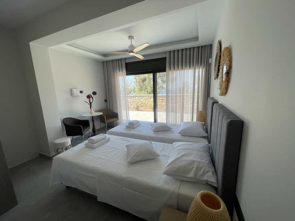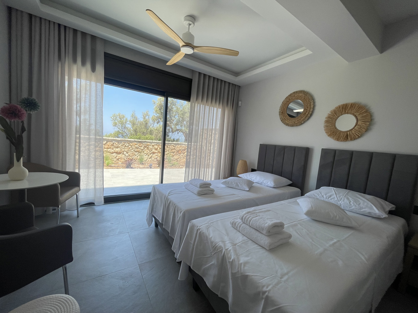 Jedno łóżko podwójne, lub dwa łóżka pojedyncze, prywatna łazienka, wyjście na taras z widokiem na morze.