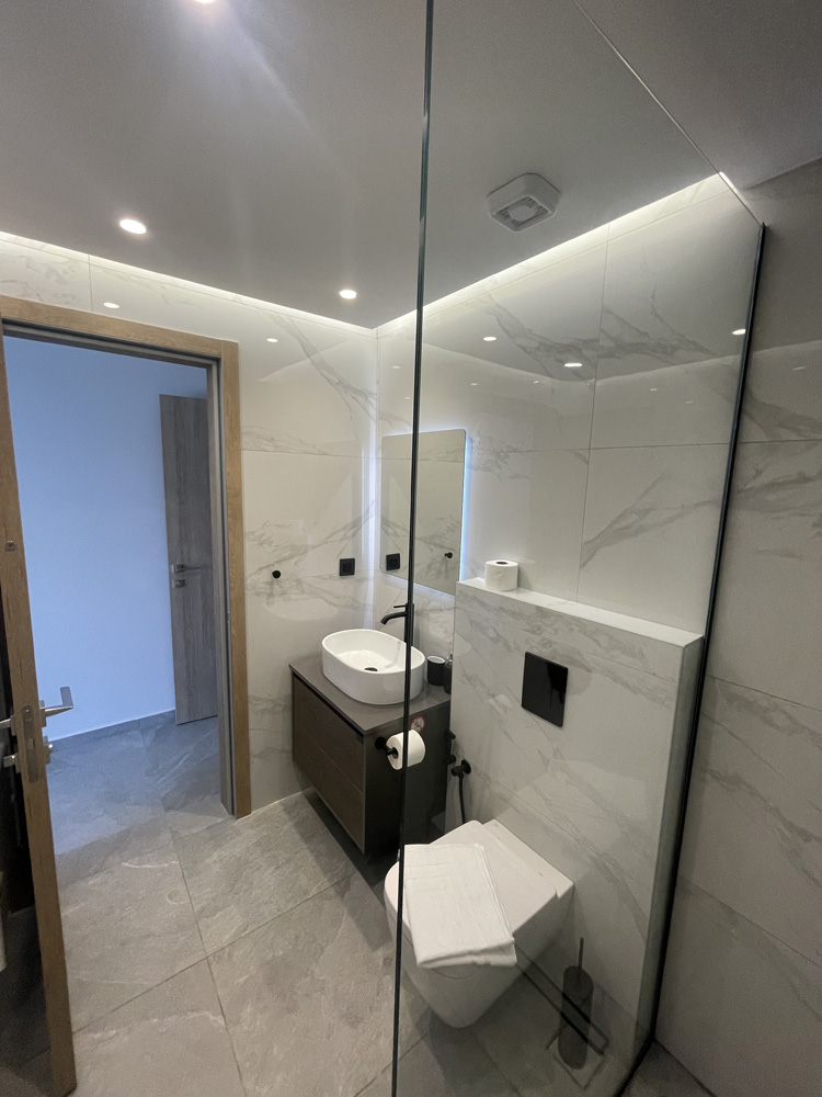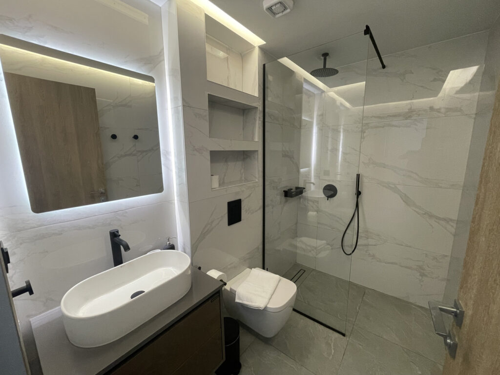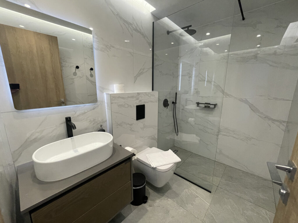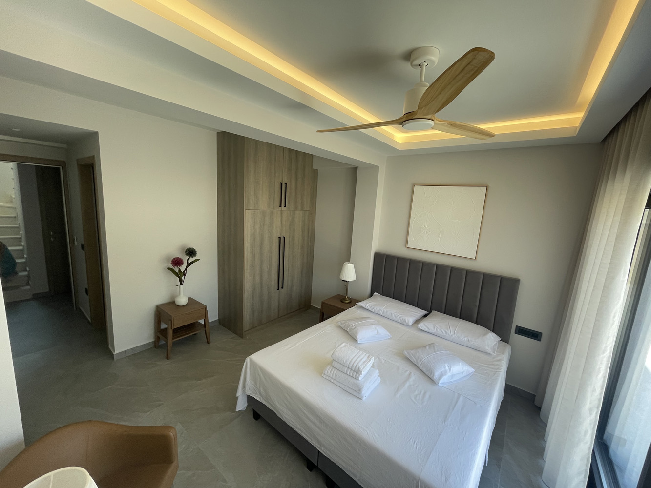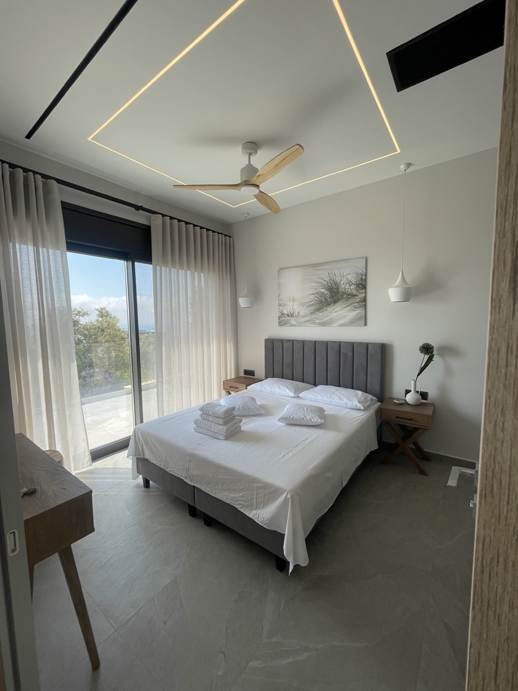 Jedno łóżko podwójne, lub dwa łóżka pojedyncze, prywatna łazienka, wyjście na taras z widokiem na morze.